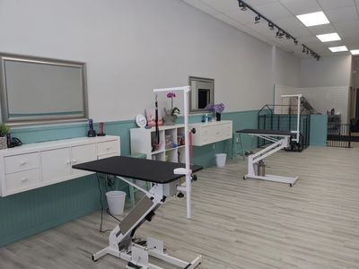 Lavish Dog Spa offers one on one cage free grooming. That means each groomer only works on one pet family at a time from start to finish. The salon is a completely open concept including the bathing area. The drying room however is a closed off to help contain the flying dog hair.